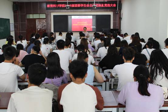 6月14日中午,我院在老图书馆四楼教学技能实训室举行团委学生会主席团换届竞选大会。学院全体辅导员老师以及各年级学生干部代表100余人参加会议。